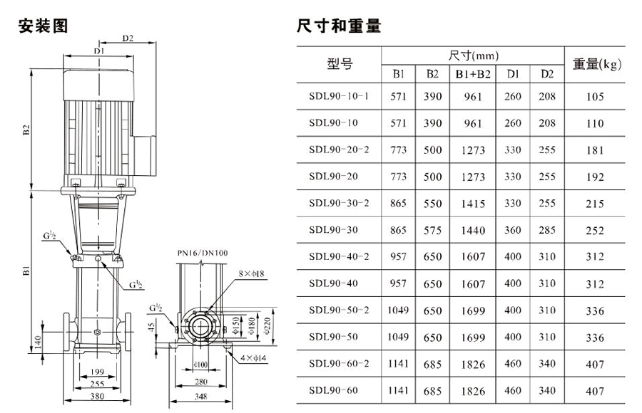 SDL90/SDLT90立式多級離心泵其管道式結構可以確保泵可直接安裝在進出在同一水平線上且管徑相同的水平管路系統中,這種設計使泵的結構和管路更為緊湊。